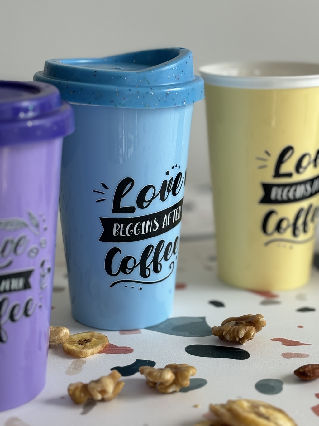 Vaso mug SIN grip, con tapa de silocona en mismo color. Grafica impresion con frase "Love beggins after coffee" Vaso de doble inyeccion, con exterior en material eco sustentable: madera + plastico. Interior blanco apto contacto con alimentos. Càmara de aire entre ambos vasos.